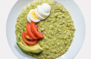 Place the cooked split peas in a small saucepan with almond milk. Cook over high heat until the majority of the liquid is absorbed, about 7 minutes. Add the broccoli, cover and cook for an additional 3 minutes. While the peas and broccoli cook, fry four eggs in a buttered nonstick frying pan. Divide split pea and broccoli mixture into four bowls. Top each with an egg and avocado slices, and add salt, pepper and hot sauce if desired before serving.