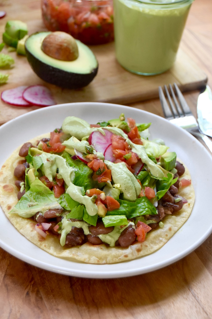 - Top the tostada with a few spoonfuls of warm pinto beans, a drizzle of the cashew sauce, and desired toppings (lettuce, avocado, pico de gallo, cilantro, etc).