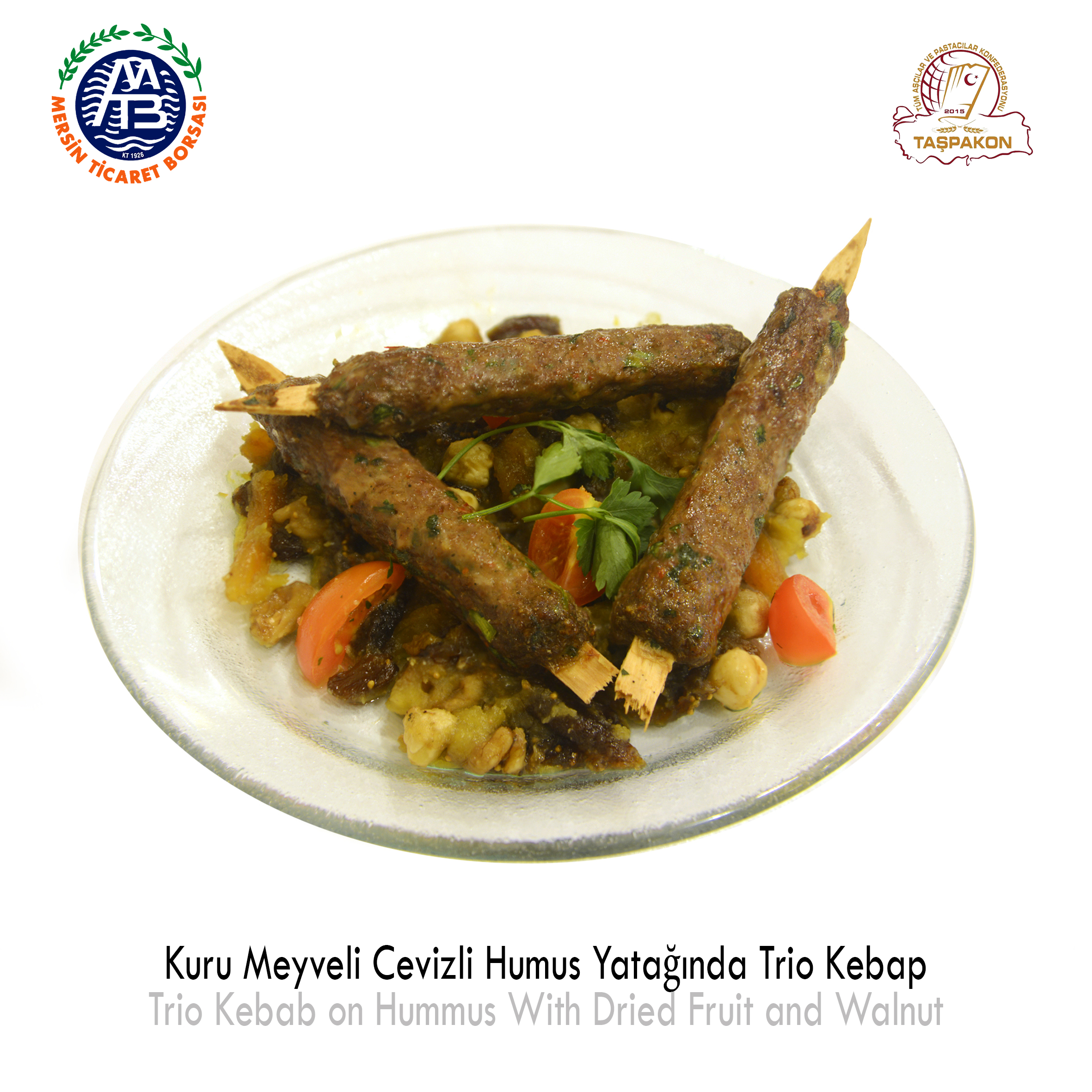 Trio Kebab on Hummus with Dried Fruit and Walnut