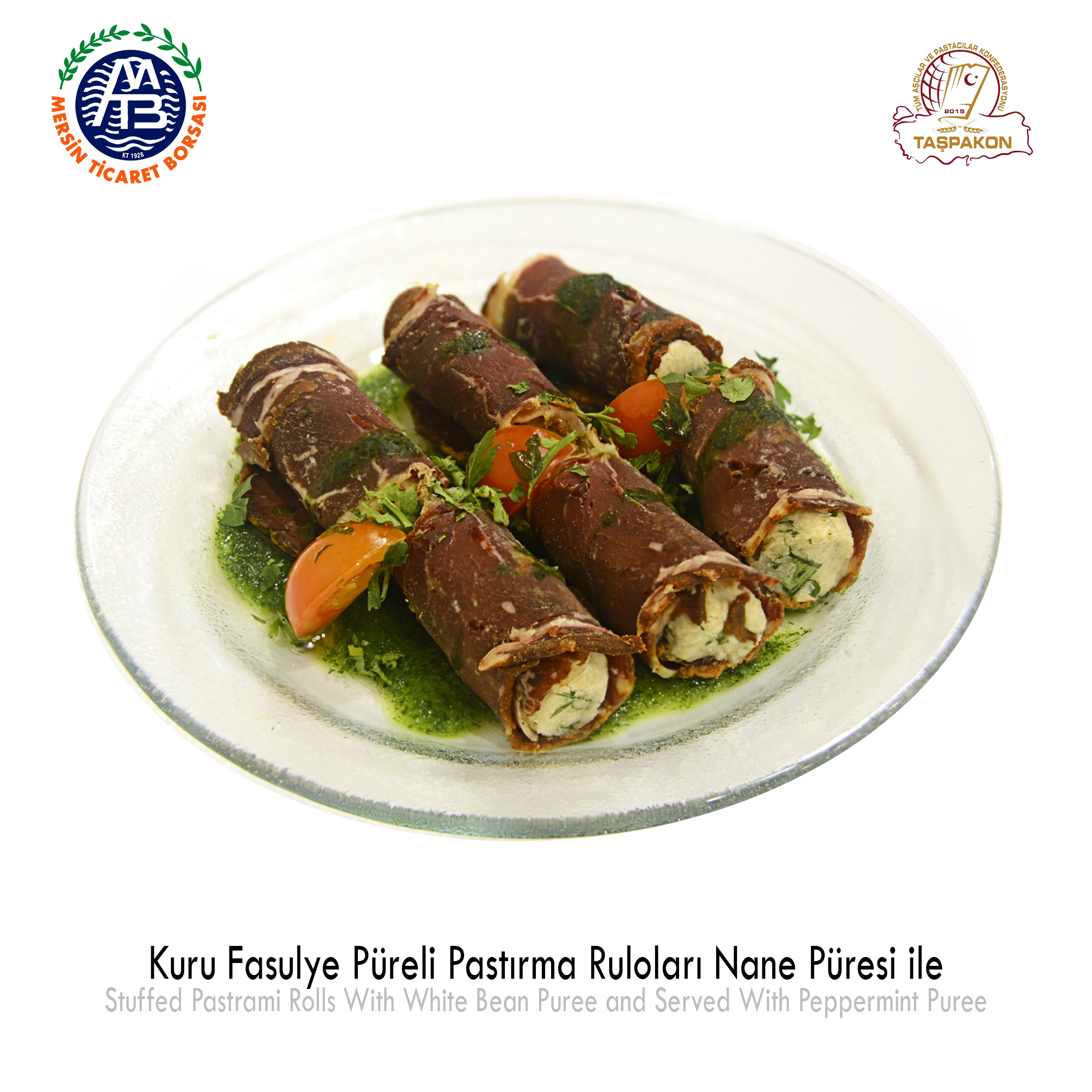 Stuffed Pastrami Rolls with White Bean Puree and Served with Peppermint Puree