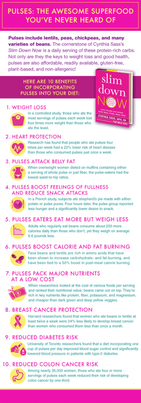 As a food lover I’m also blown away by the culinary versatility of pulses. For all of the reasons above, I included a daily serving of pulses in the eating plan in my newest book Slim Down Now: Shed Pounds and Inches with Real Food, Real Fast. I also personally created all 100+ recipes in the book, and had a blast incorporating pulses into a wide range of dishes, from stir frys, hearty soups, veggie lasagnas, salads, and dips to puddings, smoothies, pumpkin bread, popsicles, brownies, and dark chocolate truffles. I can’t think of another food group that could possibly be incorporated into such a wide array of recipes – the possibilities are endless. And with every bite you’ll be improving your health, and the health of the plant.